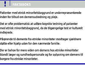 Summary Dementia in ethnic minorities Ugeskr Læger 2010;172(20):1527-1531 The elderly population of ethnic minorities is increasing in most Western countries, but ethnic minority patients are underrepresented in dementia assessment and care. This may in part be due to cultural perceptions of dementia and lack of knowledge about the available support among ethnic minorities. Also, it can be difficult to make clinical assessments of ethnic minority patients who do see a physician for dementia symptoms. In particular, the interpretation of cognitive test results represents a major challenge.