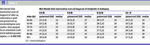MMSE er det mest benyttede kognitive screeningsinstrument, men er i de fleste studier fundet at være påvirket af såvel uddannelsesniveau som etnicitet [18] (se Tabel 1 ). MMSE er oversat til mange forskellige sprog, og der er benyttet forskellige strategier til at tilpasse MMSE, så den er bedre anvendelig til forskellige etniciteter og uddannelsesniveauer. I et studie fandt man f.eks., at 25% af personerne i en gruppe med mindre end ni års skolegang scorede 18-23 på MMSE, hvilket normalt opfattes som udtryk for et betydeligt reduceret kognitivt funktionsniveau [20]. Det foreslås derfor at benytte 17/18 som cut-off , da det øger testens sensitivitet over for demens hos lavt uddannede personer fra etniske minoriteter. Dette synspunkt støttes i andre studier [21, 22]. En indvending mod denne tilgang er imidlertid, at man risikerer, at lavt uddannede personer fra etniske minoriteter får stillet demensdiagnoser langt senere i forløbet og dermed ikke får tilbudt den relevante behandling.