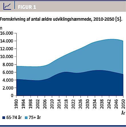 Det eksakte antal udviklingshæmmede personer i Danmark kendes ikke, men det estimeres til at være 80.000-110.000 [3]. Andelen af ældre i denne gruppe skønnes at være mindst halvdelen, og denne andel forventes at ekspandere i de kommende år som følge af stigende levealder [4] (Figur 1). Prævalens af demens blandt personer med udviklingshæmning uden DS er påvist at være sammenlignelig med prævalensen af demens i baggrundsbefolkningen (personer uden udviklingshæmning) [6].