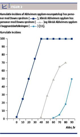 Som følge af triplikation af kromosom 21 sker der en overproduktion af proteinet β-amyloid (Aβ) ud fra APP allerede fra andet årti af levetiden. β-amyloid er i fibrillær form den primære komponent af amyloide plaques og udgør en del af de neuropatologiske forandringer ved AD [8]. Andre gener på kromosom 21, såsom superoxid dismutase og S100a, antages at kunne have betydning for udvikling af AD [9]. Der kan hos de fleste – og måske alle – personer, der har DS og er over 40 år, påvises kortikale aflejringer af amyloide plaques og neurofibrillære sammenfiltninger [10].
