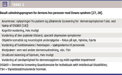 Indholdet af et basalt udredningsprogram for demens hos personer med DS syndrom er skitseret i Tabel 2.