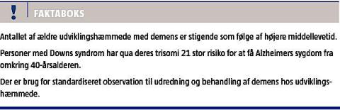demens hos disse personer, og samtidig øges behovet for, at den pædagogiske og sygeplejefaglige indsats bliver justeret. I et større antal kommuner i Danmark har man nu særligt fokus på boligændringer i forbindelse med stigningen i antallet af ældre og demente udviklingshæmmede borgere. Dette indbefatter en større differentiering i behovet for bolig, boligindretning og i hjælpen til den enkelte [4]. Samtidig uddannes et større antal pædagoger og demenskonsulenter i at observere og intervenere pædagogisk og miljømæssigt ved demens hos personer med udviklingshæmning og at inddrage en læge, når det er påkrævet.