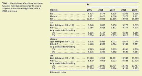 Det beregnede resurseforbrug fremgår af Tabel 1 , hvor de fremtidige sundhedsomkostninger er beregnet med forskellige antagelser omkring incidens og overdødelighed hos demensramte samt årlig stigning i social- og sundhedsvæsenets produktivitet. Social- og sundhedsvæsenets omkostninger til behandling og pleje af personer med demens i 2005 er beregnet til at udgøre 5,5-12,8 mia. kr. afhængigt af, hvilke incidensrater der anvendes. Omkostningerne øges i 2015 til 6,2-15,0 mia. kr. og i 2020 til 7,0-16,7 mia. kr. Med en simpel ekstrapolation af kendte data er der altså tale om en ret betydelig stigning i social- og sundhedsvæsenets omkostninger på omkring 17% frem til 2015 og på 30% frem til 2020.