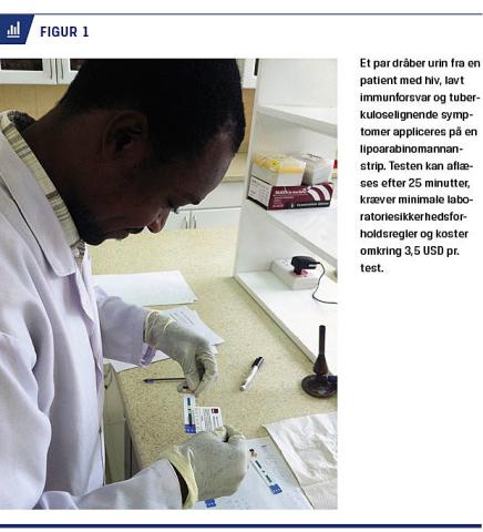 En ny billig point-of-care (POC)-test er lipoarabinomannan (LAM)-urintest, som har vist høj sensitivitet netop blandt hiv-inficerede med lavt immunforsvar. Med testen kan man påvise udskillelse af et Mycobacterium tuberculosis-deriveret lipopolysakkaridantigen, LAM, i urinen, og den kan gennemføres på under 30 min (Figur 1). WHO anbefaler, at LAM-testen kan