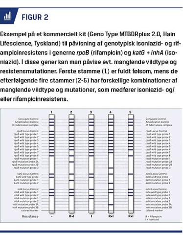 Det har altid været en udfordring for tb-diagnostik, at M. tuberculosis vokser langsomt, særligt i forhold til resistensbestemmelse. DNA-baserede diagnostiske metoder giver nu mulighed for et hurtigt resistenssvar, og det udnyttes f.eks. i Xpert-RIF-platformen, hvor påvisning af resistens mod rifampicin sker samtidigt med den diagnostiske tb-PCR-måling [16, 17]. Det har stor betydning i lande med høj forekomst af MDR- eller XDR-tb. Der er imidlertid en række andre stoffer, som det er vigtigt at få resistensdata for, og i Danmark er isoniazidresistens det mest betydende resistensproblem. Der er udviklet PCR-baserede kommercielt tilgængelige kit, hvormed man kan påvise hyppige mutationer i såkaldte hot spots, som er associerede med M. tuberculosis-resistens (Figur 2). For isoniazid og rifampicin er følsomheden på isolater hhv. ca. 99% og 98% sammenlignet med fænotypisk (dyrkningsbaseret) resistensbestemmelse [18]. For andenlinjeantibiotika kan fluorquinolon og aminoglykosid-cyclopeptidassocierede resistensmutationer på isolater påvises med hhv. ca. 83% og 77% følsomhed [18]. Ultimativt kan man med helgenomsekventering kortlægge »hele« M. tuberculosis-genomet og hermed påvise alle kendte resistensfremkaldende mutationer støttet af onlinedatabaser som f.eks. PhyREsSE [16, 19]. Trods fremskridt er der stadig mange udfordringer ved genotypisk resistensbestemmelse såsom endnu ikke kortlagte resistensmutationer, ubetydende mutationer/polymorfier, som ikke medfører resistens, og manglende viden om kombinationer af mutationer evt. sammenholdt med patientens genetik. Fænotypisk resistensbestemmelse baseret på kritiske koncentrationer af M. tuberculosis, som vokser i dyrkningsmedier tilsat antibiotika, er fortsat »referencestandarden«, og i praksis komplementerer geno- og fænotypisk resistensbestemmelse hinanden i laboratoriet [17, 20]. På længere sigt vil den viden, der i disse år genereres i højindkomstlandes speciallaboratorier, forhåbentlig også komme lavindkomstlande med tb-problemer til gavn.