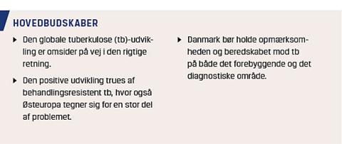 År for år stiger antallet af patienter med aktiv tuberkulose (tb). I den seneste WHO-rapport lød estimatet på 10,4 mio. nye tilfælde i 2015 [1]. Heraf dør formentlig 1,5 mio., hvilket gør tb til den infektionssygdom, som forårsager flest dødsfald, nu hvor den globale dødelighed af hiv, takket være udbredelsen af antiviral behandling, er faldet. Går vi i ring? Er der slet ikke sket fremskridt? Der er heldigvis positive nyheder, for bag stigningen i absolutte tal gemmer sig en væsentlig relativ reduktion i såvel global tb-prævalens som tb-dødelighed – men det går blot alt for langsomt. Der er sket en reduktion i tb-prævalens på 42% og i tb-dødelighed på 47% i perioden 1990-2015, således at De Forenede Nationers millennium development goals om halvering af forekomst og mortalitet næsten blev indfriet, idet det er lykkedes i alle WHO-regioner på nær Afrika [1].