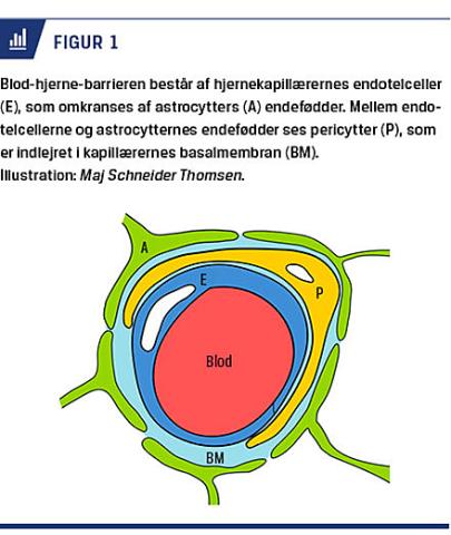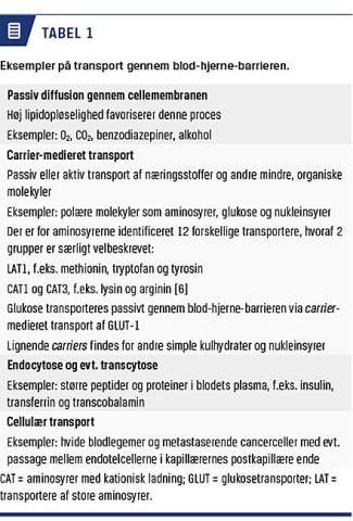 og den vaskulære basalmembran den neurovaskulære enhed (NVU) (Figur 1). BHB udgør en særdeles tæt, men samtidig dynamisk overgang mellem hjernen og det øvrige legeme. Den forhindrer effektivt vandopløselige molekyler i blodets plasma helt ned til de mindste næringsstoffer som aminosyrer og glukose i frit at kunne diffundere ind i hjernen [4]. Til gengæld indeholder endotelcellerne transportører af næringsstoffer, som på en fint reguleret måde transporteres gennem BHB (Tabel 1). Flere transportører af næringsstoffer er samtidig betydningsfulde for transport af centralnervesystemet (CNS)-aktive lægemidler gennem BHB. Hjernens kapillærer udtrykker også et særligt efflukssystem bestående af P-glykoproteiner (P-gp), som kan transportere lægemidler af fedtopløselig natur tilbage til blodbanen, og dermed er BHB også et værn mod fedtopløselige molekyler [4].