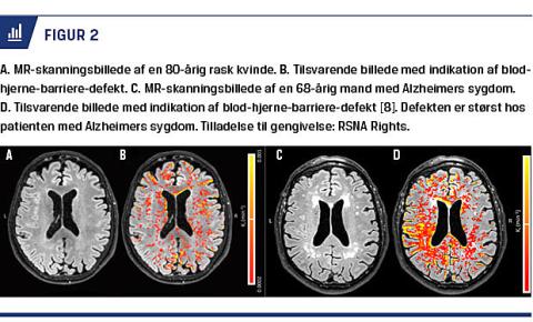 makroglobulin og apolipoproteiner kan trænge gennem karvæggen og diffundere videre ind i hjernens interstitielle rum [25]. Herfra vil de gradvis udstanse et tyndt perivaskulært rum, som er beliggende i mellemrummet mellem endotelets basalmembran, der også omslutter pericytterne, og astrocytters endefødder [25]. Cellerne i NVU vil samlet reagere med en fortykkelse af basalmembranen gennem forøget syntese af basalmembranproteiner. Gradvist nedsættes funktionen i hjerneendotelet, hvilket kan medføre øget permeabilitet af BHB [26]. På denne måde vil BHB gradvist nedbrydes i den aldrende hjerne gennem forværring af arteriosklerose i arterier, mens der først sent i sygdomsudviklingen forekommer direkte påviselige forandringer i endotelet [26-28].