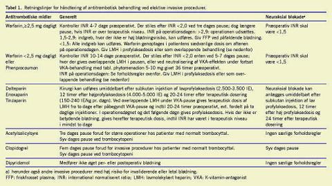 Der findes i litteraturen talrige forslag til regulering af antitrombotisk behandling ved elektive, invasive procedurer, men kun konsensus på få områder. Tabel 1 giver forfatternes bud på summariske retningslinjer.