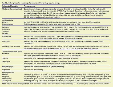 Heller ikke ved akutte, uopsættelige indgreb på patienter i antitrombotisk behandling findes der faste retningslinjer, men mange udmærkede forslag [2, 3]. Tabel 2 giver en kort beskrivelse af brugbare fremgangsmåder. I akutte situationer er det vigtigt at have kendskab til de antitrombotiske midlers eliminationshastighed, eventuelle antidoter og generelle principper for substitutionsterapi ved hæmostasedefekter.