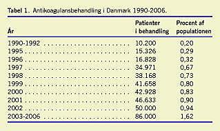 Omkring 90.000 patienter er i antikoagulansbehandling med K-vitamin-antagonister, og ca. 300.000 patienter er i behandling med trombocytaggregationshæmmere. Antallet af behandlede er i kraftig stigning (Tabel 1 ), og dette giver nye udfordringer. Hos mange patienter, specielt de intensivt medicinsk behandlede kardiologiske patienter, anvendes der i stor udstrækning flerstofbehandling med en kombination af K-vitamin-antagonister og trombocytaggregationshæmmere, hvilket stiller større krav til specialviden om blødningsrisiko og behandling heraf. Hos de ældre patienter med atrieflimren og iskæmisk stroke er der en klar indikation for antikoagulansbehandling med K-vitamin-antagonist. Desværre får langtfra alle tilbudt denne behandling, og manglende behandling med K-vitamin-antagonister resulterer hos denne patientgruppe i en næsten dobbelt så høj dødelighed som nødvendigt ifølge en dansk undersøgelse [1]. Ofte vælges alternativet antitrombotisk behandling med acetylsalicylsyre, der end ikke i kombination med clopidogrel er nær så effektivt i forebyggelse af tromboemboliske komplikationer som K-vitamin-antagonister [2]. Det snævre terapeutiske interval for behandling med K-vitamin-antagonister og frygten for blødning synes fortsat at være den limiterende faktor for, at læger iværksætter den relevante antikoagulansbehandling.