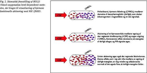 For at forstå metoden er det nødvendigt at se lidt nærmere på den tilgrundliggende fysiologi. Allerede i 1960'erne blev det, som tidligere omtalt, vist, at ilttensionen stiger i aktiverede hjerneområder (4). Senere fandtes, at gennemblødningen stiger mere end iltforbruget ved ekstrem aktivering i form af det epileptiske anfald (10). Med PET-metoden er det siden vist, at hjernens regionale gennemblødning stiger betydelig mere end iltforbruget i fysiologisk aktiverede områder (11). Dette betyder, at ved funktionel aktivering stiger, alt andet lige, mængden af iltet hæmoglobin i hjernen, og tilsvarende aftager mængden af afiltet hæmoglobin (Fig. 2). Imidlertid stiger hjernens blodvolumen også, når gennemblødningen stiger, hvilket vil føre til en øgning af mængden af både iltet og afiltet hæmoglobin. Det er den førstnævnte af disse to faktorer, der dominerer, hvad angår deoxyhæmoglobinmængden. Dette er den afgørende faktor for BOLD-metoden, thi deoxyhæmoglobin er i modsætning til oxyhæmoglobin paramagnetisk, dvs. deoxyhæmoglobin påvirker MR-signalet. MR-signalet bliver således kraftigere, når mængden af deoxyhæmoglobin aftager (12, 13). Men ændringen er kun få procent, og det er kun lige akkurat, at det kan måles med 1,5 Tesla MR-scannere. Ved højere feltstyrke forbedres signal/støjforholdet.