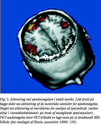 I forlængelse af disse undersøgelser udførtes studier af tilfældige, frivillige øjenbevægelser i mørke. Fra dyreeksperimentelle undersøgelser ved man, at der findes områder i den occipito-parietale cortex, som aktiveres som følge af proprioceptiv feedback fra øjenmusklerne. Disse occipito-parietale områder modtager således dels oplysninger om, hvorledes øjnene er placeret i forhold til kraniet og dels feedback fra de motoriske områder i det føromtalte frontale blikcenter. Det frontale blikcenter sender formentlig information om den tilsigtede bevægelse, så det indre kort af omverdenen (antagelig placeret i parietallappen) kan forberedes, før øjenbevægelsen finder sted. Undersøgelserne viste, at der som forventet var aktivering af det frontale center for øjenbevægelser. Herudover fandtes en udtalt aktivering af de visuelle associationsområder, men ikke af den primære visuelle cortex, som ligger helt bagtil i occipitalpolen (Fig. 3) (20). Forventningen om at skulle analysere nye synsinput sætter således hele den visuelle associationscortex i en beredskabstilstand, så den er aktiveret og »koncentreret« om den nye opgave.