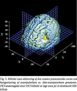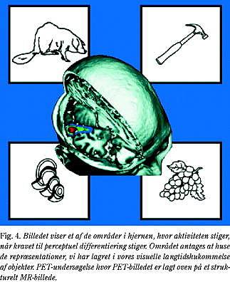 i synsindtrykket, men ikke bringe dem sammen til en helhed. For eksempel kan delelementer som øjne, hals, næb, farve osv. beskrives, uden at patienten kan se, at det er et billede af en svane. Dog kan patienten til tider, efter at have diskuteret og overvejet alle delelementerne, tænke sig frem til, at billedet bør forestille en svane. Et fra litteraturen velkendt og ret grelt eksempel på visuel agnosi er en patient, der var ude af stand til at genkende sin egen kone. Begyndte hun imidlertid at tale, og hørte han hendes stemme, var han straks klar over, hvem det var. Ligeledes kunne han eventuelt genkende hende, hvis hun havde nogle af de sko på, som hun havde haft gennem mange år. Visuel agnosi berører oftest evnen til at genkende alle genstande, men i sjældne tilfælde synes genkendelsesproblemerne at være begrænset til enkelte kategorier af genstande (kategori-specifik visuel agnosi). Det er således beskrevet, at nogle patienter har svært ved at genkende naturlige genstande (dyr, planter, frugter etc.), mens de stadig er i stand til at genkende menneskeskabte genstande (borde, stole, biler etc.). Det modsatte mønster er imidlertid også set. For at undersøge disse kategori-specifikke aspekter nærmere udførtes en undersøgelse på normale forsøgspersoner, som blev præsenteret for hhv. naturlige og menneskeskabte genstande, de skulle bedømme forskellige forhold ved. Resultaterne viste, at genkendelsen af naturlige genstande rekrutterede større dele af temporallappen sammenlignet med menneskeskabte genstande, specielt når genstandene blev vanskeligere at identificere (23, 24). Dette kan korrespondere til graden af perceptuel differentiering, som kræves for at sammenligne synsindtrykket med repræsentationer lagret i den visuelle langtidshukommelse (Fig. 4). Man fandt desuden, at kategorisering af menneskeskabte genstande også aktiverede områder i den præmotoriske cortex, formentlig fordi viden om menneskeskabte genstande er tæt knyttet til, hvorledes man agerer med genstandene (25). I opfølgende studier har vi underbygget denne antagelse ved at vise, at kategorisering af manipulerbare genstande (frugt/grøntsager samt beklædningsgenstande) sammenlignet med kategorisering af ikkemanipulerbare genstande (eksempelvis huse og dyr) aktiverer den præmotoriske cortex (Fig. 5) (personlig meddelelse).