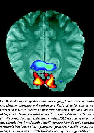 stimulation under søvn har ført til interessante observationer, idet aktiveringsmønstret er helt forskelligt fra det, der ses hos vågne forsøgspersoner. Den visuelle stimulation blev gennemført med blinkende lys (som kan registreres, når øjnene er lukkede). Hos vågne forsøgspersoner (med lukkede øjne) ser man, som ved andre former for stimulation, en kraftig aktivering med øget BOLD-respons i den visuelle cortex, men hos de sovende forsøgspersoner sås et fald (Fig. 6). Efterfølgende undersøgelser med PET-teknikken har bekræftet, at der rent faktisk er et fald i blodcirkulationen i den visuelle cortex hos de sovende forsøgspersoner i modsætning til en stigning i gennemblødningen hos de vågne forsøgspersoner (personlig meddelelse). Umiddelbart kunne fundet virke noget besynderligt og paradoksalt. Men egentlig svarer det ganske godt til reaktionerne under søvn. Det vides således at være svært at vække en sovende forsøgsperson