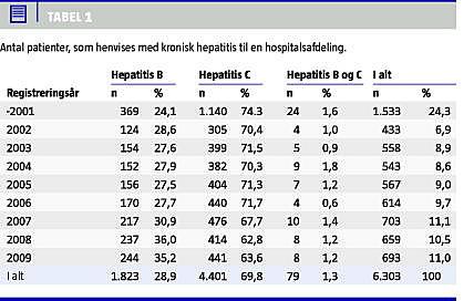 I alt var der pr. 31.12.2009 inkluderet 6.303 patienter i DANHEP, hhv. 1.902 patienter med kronisk HB og 4.480 med kronisk HC (79 har begge typer). Patientantallet er steget fra ca. 400 pr. år til ca. 700 pr. år, og da 2.524 patienter har et afsluttet forløb, følges 3.858 patienter med kronisk hepatitis ultimo 2009 i hospitalsregi i Danmark.
