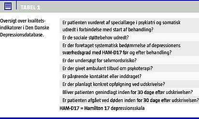 I 2009 blev der for unipolar depression hos voksne taget initiativ til at udvikle en landsdækkende klinisk kvalitetsdatabase, som nu er videreført i regi af Regionernes Kliniske Kvalitetsudviklingsprogram. Databasen blev implementeret nationalt den 1. januar 2011 med det formål at måle kvaliteten af udredning og behandling vha. en række kvalitetsindikatorer, der var fastsat af en tværfagligt sammensat styregruppe (Tabel 1 ). Databasen dækker det sekundære sundhedsvæsen, men skal på længere sigt udbredes til også at omfatte primærsektoren [1, 2].