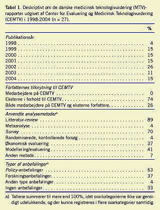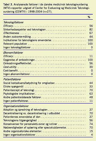 Materiale og metoder : Studiet er gennemført som et struktureret litteraturreview af samtlige 27 MTV-rapporter udgivet af Center for Evaluering og Medicinsk Teknologivurdering i 1998-2004 og er baseret på den danske inddeling i fire hovedfaktorer: teknologien, økonomien, patienten og organisationen foruden forskellige deskriptive variable.