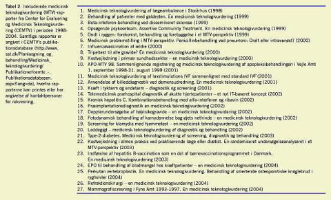 Summary The Danish HTA model: a systematic review of Danish HTAs published by CEMTV from 2000 to 2004 Ugeskr Læger 2006;168(21):2074-2078 Introduction : A common, broad definition of health technology assessment (HTA) has been agreed upon at the international level. The aim of this study was to investigate whether Danish HTA studies actually use this definition in practice. Materials and methods : The study was conducted as a systematic literature review of the 27 HTA reports published by CEMTV from 1998 to 2004. The reports were analysed according to the four main components of the Danish HTA definition: technology, economics, the patient and the organisation, as well as various descriptive variants. Results : The study showed that the broad definition of HTA is widely used in Denmark and that the partial use of the HTA concept is not used. All the Danish HTA studies included assessments of both technology and economic factors and from a variety of standpoints, and more than 90% also included assessments of patient and organisational factors. The literature review was the most commonly applied assessment method, while RCT and meta-analysis were rarely used. Two-thirds of the HTA studies provided direct policy recommendations. Conclusion : In a policy decision-making framework, the Danish HTA reports were found to be more satisfactory than international HTA reports because of their extensive information content and the conscious effort to inform policy decision making.