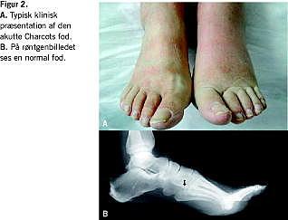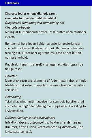 Summary Charcot's arthropathy Ugeskr Læger 2008;170(33):2440-2445 Charcot's arthropathy is a rare complication to diabetes with peripheral neuropathy. The diagnosis is based on a red, oedematous foot with 2 °C difference in skin temperature between the affected foot compared to the unaffected foot. The condition is characterised by fractures, dislocation of joints and deformity. The treatment is off-loading. When the off-loading treatment is completed, the patient should gradually adjust to wearing bespoken shoes. Lifelong control of the feet and shoes is necessary.