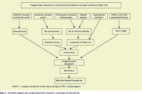 Ubehandlet vil skaderne forværres og ved »dominoeffekt« brede sig til naboknoglerne, således at fodens skelet bliver ustabilt og synker sammen. Blodgennemstrømningen i fødderne er øget pga. autonom sympatisk denervering [8], hvilket muligvis kan medføre demineralisering og ændring af osteoklast-osteoblast-interaktionen. Inflammation ved Charcotprocessen fører til yderligere stigning i blodgennemstømning og omlægning af mikrocirkulationen, hvilket måske kan medvirke til resorptivt knogletab [9]. Det er vist, at tumornekrosefaktor α og interleukin 1-β har en stimulerende effekt på nukleære transkriptionsfaktorer, der medfører øget ekspression af osteoklastaktiviteten. Herudover har receptor activator of nuclear factor-κβ-ligand (RANKL)/osteoprotegerin (OPG)-systemet [10] også været tillagt betydning for den lokale svækkelse af knoglestrukturen, samtidig med at det også er tillagt en plads i patogenesen til vaskulære kalcifikationer (Mønckenbergsklerose), som hyppigt ses hos patienter med CA [11] (Figur 1).