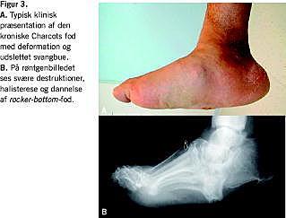 Tilstanden viser sig ved ensidig hævelse, varme og evt. rødme (Figur 2). Patienterne anfører ofte, at de har ukarakteristiske symptomer i form af uro, murren og fornemmelse af instabilitet, men de har i reglen ingen smerter. CA kan opstå symptomfattigt, blot med hævelse og øget hudtemperatur, men diagnosen bør alligevel haves in mente, og foden bør straks aflastes (se nedenfor). En del af patienterne har et mindre traume. Et næsten gennemgående karakteristikum er et forløb på 1-3 måneder mellem symptomstart og diagnose. Dette indebærer ofte udvikling af deformitet, inden behandlingen sættes ind. Deformitet er oftest karakteriseret ved sammenfald af fodbuen, i værste fald i form af en såkaldt gængefod (rocker-bottom) -deformitet med plantar konveksitet (Figur 3). På grund af den ændrede fodarkitektur vil disse patienter have en abnorm trykfordeling plantart. Dette kombineret med neuropatien medfører callusdannelse og en øget forekomst af fodsår [5]. Risikoen for fodsår er øget med en faktor 4-5, svarende til en incidens på knap 20% [16].