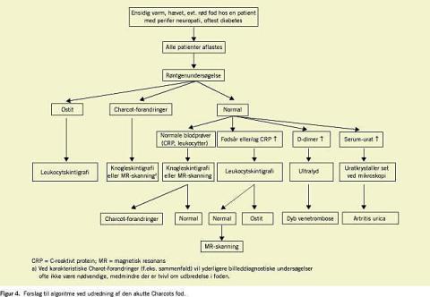 Der findes forskellige stadieinddelinger af CA [18]. I det tidlige stadium er symptomerne meget beskedne. Ofte fortsættes belastningen af foden derfor uændret, hvilket fører til knoglesammenfald, instabilitet og deformitet, yderligere hævelse og evt. sår. Det er imidlertid af yderste vigtighed, at klinisk mistanke om CA straks medfører aflastning i gips eller behandlingsstøvle f.eks. Aircast. Videre diagnostik foretages herefter med konventionel knoglerøntgen og knogleskintigrafi [19]. Knogleskintigrafien har høj sensitivitet, men ringe specificitet. Røntgenoptagelsen viser ofte helt normale forhold i de første uger, hvilket selvsagt kan afspore diagnostikken. Det understreges, at man med knoglerøntgen, der viser normale forhold, ikke kan udelukke CA, og aflastning bør fortsætte, til yderlige undersøgelser foreligger. I tvivlstilfælde er MR-skanning nyttig. Ved denne opnås den bedste billedmæssige fremstilling af knoglestrukturen. Figur 4 viser en klinisk anvendelig algoritme til diagnostisk udredning.