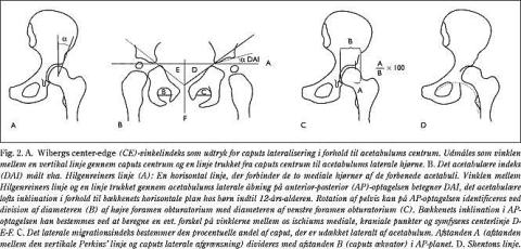 Vinklen (center-edge , CE) mellem en vertikal linje trukket gennem centrum af caput femoris og en linje gennem centrum til acetabulums laterale hjørne blev fastlagt af Wiberg (7) og anvendes til påvisning af såvel lateralisering af caput som acetabulær dybde. Hos raske voksne er CE-vinklen 20-40º (8) (Fig. 2A ).