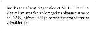 Incidensen af sent diagnosticeret MHL i Skandinavien må ud fra svenske undersøgelser skønnes at være ca. 0,5° /oo , såfremt tidlige screeningsprocedurer er veletablerede (5). Spædbarnet med sent diagnosticeret MHL har Galeazzis tegn, dvs. tilsyneladende forkortning af femur på den syge side, begrænset abduktion, asymmetriske inguinal- og glutealfolder og Trendelenburgs halten, hvis barnet er gående. Radiologisk er Shentons linje brudt, acetabulum er fladt, caput er lateraliseret i forhold til Perkins' linje og dets ossifikation er forsinket. Med behandlingen tilstræber man hurtig lukket eller åben reposition af caput til det sande acetabulum. Før reposition anvender man i mange centre præoperativ traktion evt. kombineret med gradvist stigende abduktion og indadrotation af femora. Traktionen sigter mod at positionere caput ud for acetabulum, abduktionen sigter mod at stille collum og caput horisontalt i acetabulærplanet, og indadrotationen sigter mod at ophæve collums anteversion. Anvendelsen af traktion er kontroversiel både mht. anvendelsen i sig selv, traktionstid, valg af hudtraktion eller ossøs traktion, retningen af traktionen, den anvendte vægt og om traktionen skal foregå ambulant eller under indlæggelse. Der er i litteraturen kun få kontrollerede studier over anvendelsen af traktion. Kahle et al (6) beskrev 4%'s caputnekrose i en serie af 47 sent diagnosticerede MHL, hvor 57% reponeredes lukket, og 43% blev reponeret åbent uden forudgående traktion. Morel (7) behandlede 72 MHL med præoperativ traktion, hvoraf 17 hofter var hos børn, der var ældre end fire år, og han fandt efterfølgende kun en patient med avaskulær nekrose. Af samtlige hofter kunne 77% reponeres lukket.