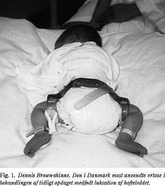 I Danmark anvendes hyppigst Dennis-Brown-skinne (Fig. 1 ). Ved teratologisk dysplasi eller svær adduktionskontraktur er ortosebehandling kontraindiceret. I ortosen tilstræbes reposition ved gradvis abduktion af hoften og vedligeholdelse af 90-110°'s fleksion. Excessiv abduktion til sikring af reposition er ikke acceptabelt pga. faren for trykopbygning i caput-acetabulum-kontaktområdet samt afklemning af den retinakulære blodforsyning til caput ved kanten af acetabulum, begge dele kan hypotetisk resultere i caputnekrose (1).