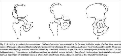 Chiaris osteotomi vil hyppigt blive anvendt til den skeletalt mature patient med symptomgivende dysplasi eller subluksation med begyndende degenerative forandringer. Teknisk er der tale om en interpositionsartroplastik uden redirektion af eksisterende hyalinbrusk, hvor regenerativ spongiøs knogle i det proksimale fragment og ledkapslen i stedet tjener til lateral forstærkning af et insufficient og fladt acetabulum. Osteotomien kræver nær normal bevægelighed i hofteleddet og højst tidlige stadier af OA. Ved osteotomien medialiseres hofteleddet til aflastning af abducerende muskulatur og ophævelse af Trendelenburgs halten. Osteotomien lægges lidt skråt forløbende, proksimalt/medialt i det horisontale plan, lateralt fra lige over den kapsulære tilhæftning til incisura ischiadicus. Det distale fragment af os innominatum forskydes medialt med acetabulum gennem forceret abduktion i en hængslet bevægelse gennem symfysen (Fig. 2B ). Chiari (22) rapporterede om 66% excellente eller gode resultater efter de første 200 osteotomier. De yngste patienter var 4-6 år, og der blev ikke angivet nogen øvre aldersgrænse. I en efterundersøgelse af 236 osteotomier, hvoraf over 90% var udført af Chiari selv, fandt Windhager et al (23) efter 25 års opfølgning excellent eller godt resultat i 51,4% af tilfældene.