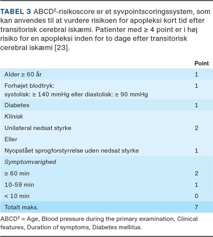 Ca. 5% af patienterne med TCI vil opleve en apopleksi < 48 timer efter symptomstart [21]. Hurtig behandling af TCI nedsætter risikoen for efterfølgende apopleksi med ca. 80% [22]. Man bør have ekstra opmærksomhed på patienter med episodisk svimmelhed og age, blood pressure during the primary examination, clinical features, duration of symptoms, diabetes mellitus (ABCD2)-risikoscore > 3-4 (Tabel 3), da de har øget risiko for apopleksi [10].