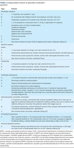 Pga. den episodiske optræden ved EVS sker det ikke sjældent, at patienten ses af en læge, efter at et anfald er overstået. Symptomerne er forsvundet, og der er ingen objektive fund ved bedside-undersøgelse. Nogle diagnoser er således baseret alene på anamnesen og anvendelse af diagnostiske kriterier. Disse kriterier er samlet i Tabel 2.