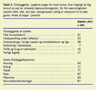 Mulige og vigtige indsatsområder over for børn er ulykker, allergi, tobak, kost og motion. Den hyppigste dødsårsag for børn er ulykker, og her tegner trafikulykker sig for den største andel [10]. Under en fjerdedel af lægerne tager ofte emner vedrørende trafiksikkerhed op, lidt flere tager emner vedrørende ulykker i hjemmet op, især fald fra puslebord. Tilsyneladende opfatter praktiserende læger ikke forebyggelse af ulykker som deres område, derimod tages emner vedrørende sygdomsforebyggelse hyppigt op.