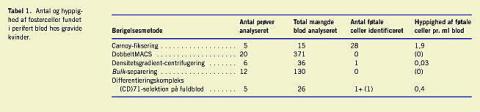 Det har været kendt i næsten 40 år, at celler passerer fra foster til mor i graviditeten. Mange har undersøgt, om disse celler kunne anvendes til fosterdiagnostik, så man derved kunne undgå den (beskedne, men veldokumenterede) abortrisiko efter amniocentese og moderkagebiopsi [1, 2]. Lymfoblaster, erytroblaster og trofoblaster har været genstand for undersøgelse. Erytroblasten har været den foretrukne, bl.a. fordi lymfocytter antages at kunne overleve i mange år efter en afsluttet graviditet [3], og fordi talrige forsøg med trofoblaster ikke har ført til overbevisende resultater [4]. Som erytroblastmarkører har føtale og embryonale hæmoglobinantistoffer været anvendt.