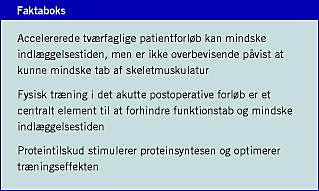 Summary The physically-inactive surgical patient Ugeskr Læger 2006;168(49):4322-4324 Major surgery is associated with a decrease in muscle strength, muscle mass and functional performance. However, early intervention with intensive physical training seems to counteract the loss in muscle mass and muscle function as well as to shorten the postoperative length of stay in hospital. In addition, a sufficient intake of protein seems to be a central element in the treatment of postoperative patients to reduce the protein degradation normally seen with immobilisation and surgery. Knowledge regarding the potential effect of preoperative physical activity is sparse.