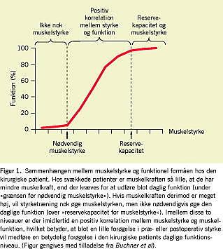 Operative indgreb er forbundet med risiko for komplikationer, tab af skeletmuskulatur, fald i muskelstyrke og specielt for ældre patienter dermed også en nedsat funktion [1, 2]. Indførelse af accelererede patientforløb i forbindelse med større operative indgreb er påvist at kunne nedsætte indlæggelsestiden, men er ikke påvist at kunne mindske tabet af muskelmasse [1]. For raske unge personer vil et tab af muskelmasse i forbindelse med et operativt indgreb ikke have den store funktionelle betydning, men for mange ældre patienter vil blot et mindre muskeltab betyde en kraftigt reduceret funktion, idet mange af disse patienter allerede forud for operationen har et aldersbetinget muskeltab (sarkopeni) og ligger på grænsen af den muskelstyrke, der er nødvendig for at kunne klare daglige aktiviteter (Figur 1 ) [3]. Omkring 20% af alle over 70 år og ca. 50% af de 80-årige har sarkopeni [3]. Dette tal vil næppe blive reduceret foreløbigt, dels pga. en generelt forøget gennemsnitslevealder, og dels pga. at flere ældre har forøget deres fedtmasse, hvilket forventeligt stiller større krav til deres muskulaturs bæreevne.