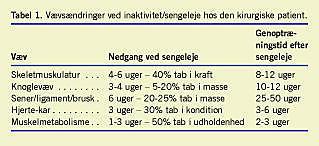 Såvel muskelmassen som muskelstyrken falder hurtigt ved inaktivitet, og hos yngre personer kan blot 7-10 dages sengeleje reducere styrken i større muskelgrupper med 10-20%, ligesom mineralindholdet i knogler og bindevævsstyrken i sener og ledbånd nedsættes [4]. F.eks. vil lårets muskelstyrke være reduceret med op til 40% efter 3-4 ugers immobilisering (Tabel 1 ), hvilket hovedsageligt skyldes et tab af muskelmasse forårsaget af en nedsat proteinsyntese kombineret med en accelereret proteinmetabolisme [4].
