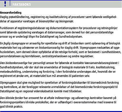 I 2002 udkom den vigtige Biobankredegørelse. Her vurderede en arbejdsgruppe nedsat af Indenrigs- og Sundhedsministeriet, at persondataloven i samspil med den relevante sundheds- og forskningslovgivning på tilstrækkelig vis regulerer de fleste sider af biobankerne [12]. Arbejdsgruppens anbefalinger blev fulgt, idet der senere blev lovgivet via sundhedslovens kapitel syv om selvbestemmelse over biologisk materiale, som afgives i forbindelse med behandling. Det betyder, at patienten i et centralt vævsanvendelsesregister har mulighed for at sige fra over for ikkebehandlingsrelateret anvendelse af biologisk materiale. Samtidig skal alle forskningsprojekter og registerforskningsprojekter, der involverer biologisk materiale, anmeldes til det regionale videnskabsetiske komitesystem. Det grundlæggende sigte med redegørelsen og lovforslagene er, at det biologiske materiale anvendes til andre formål end de, patienten er blevet informeret om og udtrykkeligt eller stiltiende har accepteret. Redegørelsen har resulteret i, at både de vævsafgivende personers integritet og samfundets behov tilgodeses i en ordning, der er enkel, forståelig og fremtidssikret.