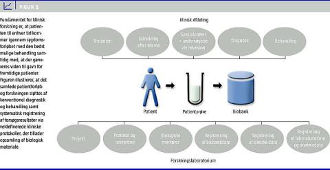 Fundamentet for klinisk forskning er, at patienten altid kommer igennem sygdomsforløbet med den bedst mulige behandling samtidig med, at der genereres viden til gavn for fremtidige patienter (Figur 1 ). Der tages udgangspunkt i det samlede patientforløb, og forskningen støttes af konventionel diagnostik, behandling og systematisk registrering af forsøgsresultater via veldefinerede protokoller. Den Hæmatologiske Biobank er både en klinisk biobank og en forskningsbiobank . Det betyder, at det arkiverede biologiske materiale både kan anvendes til udvidet diagnostik og til forskning i velbeskrevne projekter efter fastlagte kriterier [11]. Modsat en forsknings-biobank, hvor materialet i en skriftlig aftale med patienten er reserveret til et klinisk orienteret behandlingsforsøg eller til patogeneseforskning, udnyttes materialet i den kliniske biobank oftest til retrospektive valideringsstudier. For at opfylde alle retslige forhold oplyses patienten skriftligt om den kliniske biobank allerede ved den første kontakt til afdelingen. Informationen gives som beskrevet i sundheds-, persondata- og komitéloven samt efter retningslinjer i centralstyrelsesloven og andre regulativer om patientens rettigheder.