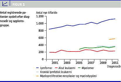 Den Hæmatologiske Fællesdatabase indeholder i dag oplysninger om flere end 25.000 patienter. I Figur 1 ses udviklingen i patientantallet siden 2000 for de enkelte deldatabaser. Ud over specifikke oplysninger om prognostiske faktorer ved diagnosetidspunktet indberettes der oplysninger om primærbehandling og respons herpå. Oplysninger om eventuelt recidiv og opfølgninger er også indberetningspligtige og stiller særlige krav til dataopsporingsprocessen. Gennem samkøringer med Landspatientregisteret og Patobank opnås valid kontrol af dækningsgraden. Efter at de første samkørsler i 2007 viste en dækningsgrad på 70-80%, har denne været stigende til nu over 95% for hele perioden. Dette er opnået gennem hyppige påmindelser til de enkelte afdelinger fra både databasesekretariat og Dansk Hæmatologisk Selskab. Patienter, der har malign hæmatologisk sygdom og ikke har forløb på en hæmatologisk afdeling, er dog ikke registreringspligtige, men udgør < 2%.