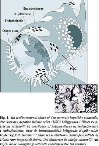 Den hepatisk stellate celle (HSC, tidligere kaldt Ito-celle, hepatisk lipocyt eller perisinusoidal celle) blev først beskrevet i 1876 af Carl von Kupffer (Sternzellen). HSC er lokaliseret cirkulært omkring sinusoiderne i det perisinusoidale rum og i Disses rum (Fig. 1 ) og udgør op til 15% af de fastboende leverceller. Den hvilende HSC, som indeholder talrige retinoidgranulae i cytoplasmaet, er det vigtigste oplagringsted for A-vitamin i kroppen (1) og regulerer desuden omsætningen af ekstracellulærmatrix (ECM) i Disses rum og blodgennemstrømningen gennem sinusoiderne. HSC aktiveres ved påvirkning af fibrogenetiske stimuli fx hepatitis B og C eller hepatotoksiske stoffer. Herved mister cellen sine retinoidgranulae, får kontraktile egenskaber og bliver »myofibroblastlignende«. Den aktiverede HSC spiller en fremtrædende rolle ved udviklingen af »det hepatiske ar« (leverfibrose/cirrose) og portal hypertension ved kroniske leversygdomme (1-5).