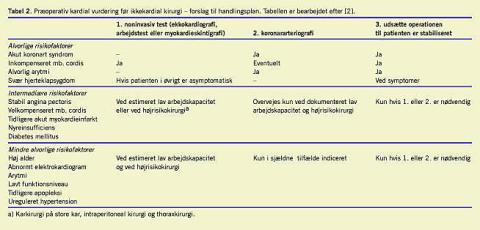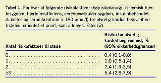 Den kardiale risikovurdering for patienter, der er ældre end 50 år, kan foretages ved hjælp af det reviderede kardiale risikoindeks (RCRI) (Tabel 1 ) [2, 3]. I RCRI scores patienterne for følgende risikofaktorer: højrisikokirurgi (karkirurgi, intraperitoneal kirurgi og thoraxkirurgi), iskæmisk hjertesygdom, hjerteinsufficiens, cerebrovaskulær sygdom, insulinbehandlet diabetes eller serumkreatinin > 180 μmol/l. Risikoen for en alvorlig kardial hændelse er 0,4% hos patienten uden risikofaktorer og øges til 5,4% ved tre eller flere risikofaktorer (Tabel 1).
