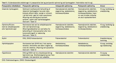 Får kirurgen ved første kontakt med patienten mistanke om utilstrækkeligt behandlet hjertesygdom, bør der i god tid før indgrebet arrangeres kontrol på en medicinsk/kardiologisk afdeling, gerne på patientens lokalsygehus, således at der gives mulighed for at iværksætte et relevant undersøgelsesprogram, før det kirurgiske indgreb gennemføres.