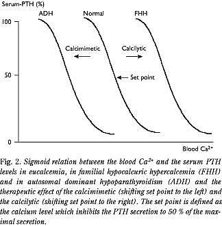Mutationer, der medfører en nedsat følsomhed for Ca2+o i CaR, resulterer i to velbeskrevne sygdomme, familiær hypokalciurisk hyperkalcæmi (FHH) (online Mendelian inheritance in Man [MIM] # 145980) og neonatal svær hyperparatyroidisme (NSHPT) (MIM # 239200).