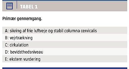 Den primære gennemgang (Tabel 1) er en systematisk ABCDE-vurdering prioriteret efter symptomernes alvorlighed målt i tid, idet obstruktion af