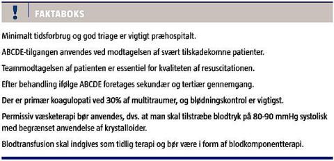 Værdien af denne undersøgelse kan udvides til vurdering af pulmonale (f.eks. pneumothorax) og kardiale forhold. Betydende ekstern blødning skal komprimeres, og tourniquet omkring ekstremiteter har på ny fundet anvendelse [24]. Permissiv hypotension (se senere) er formentlig fordelagtig under resuscitationen af patienter, der er i hypovolæmisk shock [24, 25]. Ved alvorlige hovedtraumer anbefales ikke permissiv hypotension.
