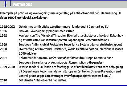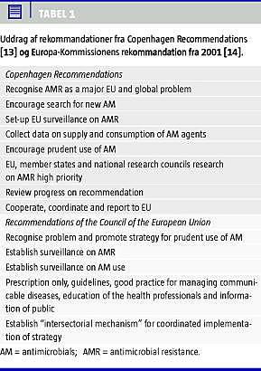 Da der i EU ikke var noget samlet fokus på antibiotikapolitik inklusive resistensområdet, indbød den danske medicinaldirektør til et EU-møde i 1998, The Microbial Threat, i København. Sundhedsmyndigheder og eksperter diskuterede emnet i tre dage, hvilket udmundede i en konsensusrapport, The Copenhagen Recommendations [13]. Denne rapport var grundstenen i en antibiotikapolitik, der burde indføres i hvert EU-land, og som kanoniseredes i 2001 i en bekendtgørelse fra Europa-Kommissionen (Tabel 1 ) til efterfølgelse i medlemslandene [14]. EU's forskningsprogrammer øremærkede forskningsmidler til antibiotikaresistensområdet, f.eks. til oprettelse af overvågningsprogrammer mhp. resistens- og forbrugsovervågning (EAARS, nu EARS-Net) og ESAC. Der blev udpeget antibiotikaresistenseksperter i hvert medlemsland; disse mødes halvårligt og diskuterer tiltag på antibiotikaområdet. Dette er nu samlet under European Centre for Disease Prevention and Control (ECDC) med hovedsæde i Stockholm. Lignende tiltag er ved at blive indført på veterinærområdet. På en stribe EU-konferencer har man siden fulgt op på diverse initiativer vedrørende forbrug, resistens og infektionskontrol. ECDC har antibiotikaresistens som et af sine satsningsområder og arrangerer og finansierer resistensmøder og andre tiltag: Den 18. november er udnævnt til »antibiotikadag" med pressekampagner, konferencer o.l. ECDC foretager desuden såkaldte landebesøg i EU-medlemslande for at inspicere og inspirere de enkelte lande til at følge kommissionens rekommandationer. Danmark havde et sådant landebesøg i januar 2009, hvor en gruppe på fire eksperter i løbet af en uge besøgte en række hospitaler og andre instanser, der er involveret i antibiotikabrug. I den efterfølgende rapport gjorde de opmærksom på positive og negative aspekter i dansk antibiotikapolitik; blandt sidstnævnte var, at vi manglede et samlende og overordnet organ (intersectorial mechanism, se Tabel 1) for koordinering af antibiotikapolitikken i Danmark. Dette blev i 2010 fulgt op af sundhedsministerens etablering af et antibiotikaråd under ledelse af Sundhedsstyrelsen.
