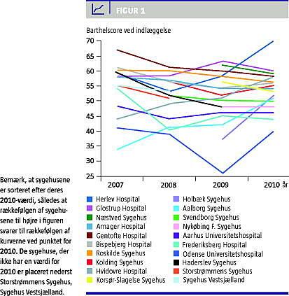 Antallet af patienter registreret pr. år har været stigende og var i 2011 på 11.974, hvoraf 62% var kvinder. Medianalderen ved indlæggelsen var 85 år for kvinder og 82 år for mænd. Den mediane indlæggelsestid, som viser store forskelle afdelingerne imellem, har generelt været faldende og var i 2011 ni dage på landsplan. Den mediane Barthel-100-score ved indlæggelse fremgår af Figur 1 . Trods kortere indlæggelsestid kan der stadig påvises forbedring af funktionsniveauet hos 70% af patienterne. Ved registreringer af BMI i årenes løb har 33-54% af patienterne været undervægtige (BMI < 22), mens 8-11% har været overvægtige (BMI > 30). De seneste år har den mediane vægtændring været 0, således har kun halvdelen af patienterne været i stand til at tage på under indlæggelse.