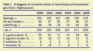 Tidligere blev dialysekatetre anlagt via v. subclavia med tilhørende risiko for pneumothorax og stenose pga. afklemning mellem clavicula og costa I. Ved at benytte v. jugularis interna er disse komplikationer reduceret [1]. Problemet ved at anvende v. jugularis interna er, at venen ligger tæt på a. carotis, og med blindt indstik vil arterien kunne blive ramt. Arterien er vanskelig at komprimere, og blødning giver ofte langvarig ømhed, stivhed og potentielt besværet vejrtrækning. Ved at anvende ultralydvejledt katerisation af venen reduceres denne komplikation væsentligt (Figur 1 ). Yderligere identificerer ultralyd venen over clavicula således, at gener ved at have det relativt stive kateter beliggende på halsen reduceres. V. jugularis interna benyttes også ved anlæggelse af et tunneleret kateter med tunnelering til forsiden af thorax. Således anlagte katetre må i ca. 25% af tilfældene lægges om pga. manglende funktion som ved tilstopning (trombose) eller læsion af katetret (Tabel 1 ). Kun sjældent må kateteret skiftes pga. infektion, når det anlægges med steril teknik inklusive steril påklædning og sterile handsker, og kateteret afsprittes ved brug til dialyse. V. subclavia kan anvendes ved trombose af v. jugularis (2%), og hos 4% af patienterne må v. femoralis benyttes.